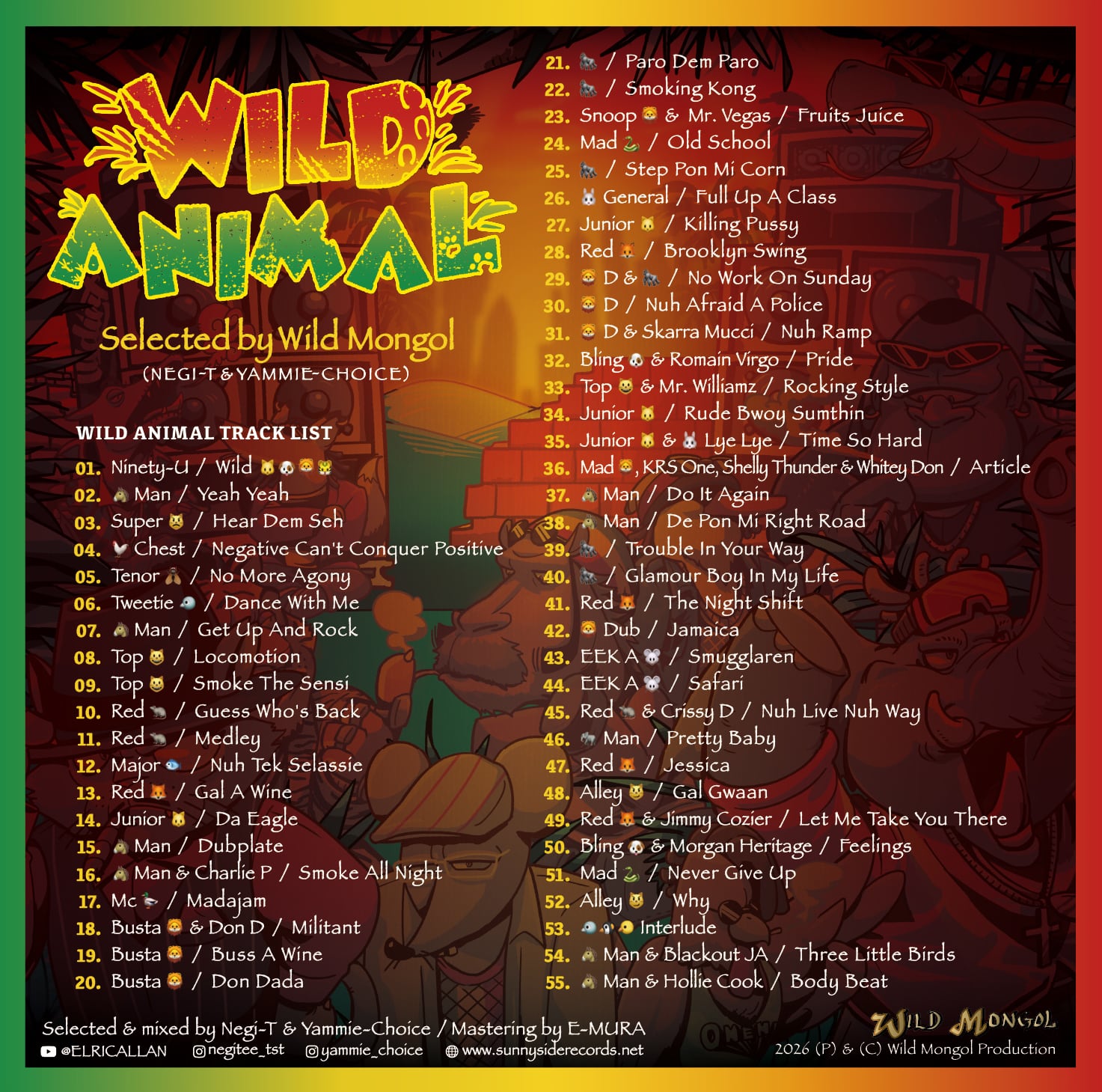 *危険を顧みない NEGI-T & YAMMIE CHOICE から成る WILD MONGOL が、死 に物狂いで生け捕りにした野生動物オンリーの珠玉のセレクションを爆誕! 題して、【 WILD ANIMAL 】 ヒトとして生まれたのに何故か動物を名乗ってしまった、“愛しくも捨て身な 生き様”を聴き、無意識に野生の本能が呼び覚まされること必至なミックス。 こんな危ない企画は、紛れもなく人類史上初となる快挙。レッツアニマライズ ユアセルフ